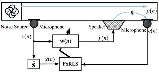 The active noise control (ANC) system is an electro-acoustic device, which can generate an anti-noise with the same amplitude, frequency and opposite phase of the undesired noise based on the principle of destructive interference. The core of the ANC system is the control algorithm. In order to improve the noise reduction performance of the ANC system, many corresponding adaptive algorithms have been developed and achieved great success. Kuo and Liu discussed the effectiveness of filtered-x least mean-squares (FxLMS) to cancel both the outside and inside noises of infant incubators in a real NICU environment, and they obtained an average reduction of 13 dB and 17 dB [1,2]. Mylonas developed a simple, robust and computationally efficient virtual sensing FxLMS algorithm and tested it in a cabin mock-up [3]. Zhang proposed a normalized frequency-domain block FxLMS (NFB-FxLMS) to reduce the interior noise of vehicles and showed that the higher the vehicle speed, the more obvious the advantages of the NFB-FxLMS [4]. Jia proposed a modified hybrid ANC algorithm combining the vibrational and acoustical signals for the reduction of road noise inside a vehicle cabin and achieved a 3.7 dBA overall noise reduction [5]. Reddy presented the application of filtered-x recursive least-squares (FxRLS), filtered-x affine projection algorithm (FxAPA) and FxLMS on an fMRI bore test-bed [6] and developed a new hybrid adaptive algorithm to balance the convergence and steady-state error based on the combination of FxRLS and FxNLMS [7]. Wu presented a hybrid active and passive noise control in the ventilation duct with an internally placed microphones module, showing that ANC can obtain more than 10 dB noise attenuation from 70 to 200 Hz when the wind speed increases from 5 to 10 m/s [8]. Sun discussed a spatial ANC system utilizing multiple circular microphones and loudspeaker arrays for a 3D space and achieved good noise-reduction performance [9]. Luo proposed a Volterra recursive even mirror Fourier nonlinear filter for the nonlinear ANC system with acoustic feedback, showing that it can achieve global noise control in closed space [10]. Kim proposed a new algorithm to enhance the convergence rate and noise reduction efficiency of ANC headsets with fixed-point DSP, reducing the broadband noise by 24 dB [11]. We notice that the FxLMS and FxRLS-based adaptive algorithms are the two of the most widely used in ANC systems. However, it is well known that the main limitations of LMS-based algorithms are their lower convergence rate than RLS-based algorithms in general, and they have a larger steady-state mean square error as compared to RLS-based algorithms [7,12,13]. Conversely, RLS-based algorithms need much more computational load. With the development of high-speed processing devices, the impact of this computational load becomes negligible. Thus, the FxRLS algorithm has gradually become a focus of attention.