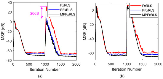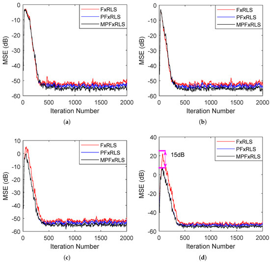In practical application, the FxRLS algorithm involves many user-defined parameters, which are closely related to its performance [14,15]. The forgetting factor and the initial gain are two such parameters. The forgetting factor is used to balance the importance of recent data and older data. A constant forgetting factor yields a fixed penalty. The forgetting factor usually chooses from 0.9 to 0.99, and a large value yields a slow convergence rate and low steady-state error. Whereas for a smaller forgetting factor, FxRLS holds a faster convergence performance and relatively higher steady-state error. The initial gain is the initial value for the gain matrix. As was pointed out by Moustakides [16], there is a variable performance of RLS as a function of the initialization of initial gain. In some cases, RLS can exhibit a significantly faster convergence when initialized with a relatively small positive definite value than when initialized with a large one. Generally, for the cases of high and medium signal-to-noise ratio (SNR), a relatively small initial gain can obtain a better performance. Whereas for low SNR, a relatively large value must be selected for achieving the best results. In [17], it is also observed that the value of the initializing constant initial gain also plays an important role in the convergence performance. Consequently, choosing suitable values for these pre-set parameters is typically a trial and error process [18]. In fact, however, the SNR is unknown, and the noise environment may be non-stationary, such that these pre-set constant parameters are not enough to meet the actual demand. Moreover, it is very difficult or rather impossible for FxRLS to be re-initialized during runtime application.