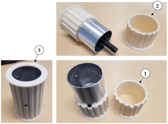 In preliminary tests, the included 80-grit sanding belt was used to convey dust from a hopper, and dust was aerosolized by a DC blower directed across the top of the belt. However, the sanding belt did not track well and would regularly get stuck against one side of the dust hopper. Instead, a heavy-duty rubber 375H400 timing belt (D&D Global, Rock Valley IA, USA) was used because it could be positively driven via a toothed pulley, and because timing belt pulleys have raised flanges that help to center the belt during operation. Since no suitable 10 cm (4 in.) wide timing pulley was available, custom 18-tooth timing belt pulley sleeves were 3D printed using ABS plastic filament. The Ryobi drive and idler pulleys had different dimensions, so the custom pulley sleeves were designed with the same outer tooth and flange dimensions but different inside dimensions so they would fit tightly onto the original aluminum pulleys. The sleeves were 3D printed as split mating halves that fit over the tapered aluminum Ryobi drive and idler pulleys, and the halves were permanently attached using adhesive (Figure 4). The drive pulley sleeve included a hole to allow access to the setscrew used to secure the aluminum drive pulley to the steel drive shaft.