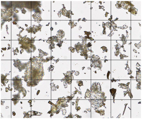 Red oak wood was selected to study the effects of a single source of dust. Rough sawn red oak boards were purchased from a sawmill and reduced into approximately 12.7 mm (0.5 in.) wood chips using a chipper. The wood chips were bagged and transported to a controlled environment chamber at Penn State University where they were spread out on the floor and dried at 33 °C (92 °F) for 72 h. The dried wood chips were then transported to the Agricultural and Biological Engineering Building at Penn State University for further size reduction using a Munson SCC-10-MS rotary cutter (Munson Machinery Co., Utica, NY, USA) with a 1.6 mm (0.06 in.) diameter screen. The Munson grinder outlet had a chip collection basket at the bottom, and the top had a high-volume centrifugal dust collection system fitted with a fine mesh filter bag secured to a plastic 208-L (55 gallon) drum. Typical operation of the grinder involved collecting the coarse ground material and discarding the fine dust. However, the fine dust was needed, thus we collected fine dust from the 208 L (55 gallon) drum, then reprocessed the coarse particles through the grinder multiple times for further size reduction. The fine dust was then run through a mechanical sieve fitted with an 80-mesh filter cloth, and the fines were collected and bagged for use. The fine dust was placed on a metal pan and dried in an oven at 55 °C (131 °F) for 72 h to a moisture content of 4.8% (d.b.) before being used in the dust generator. Figure 9 shows a microscope image of the sieved red oak dust on a 50-micron grid. Figure 10 shows a graph of the sieved red oak dust particle size distribution. The mean particle length was 21 microns (n = 100 particles, min 2.1, max 160.6, SD 20.3).