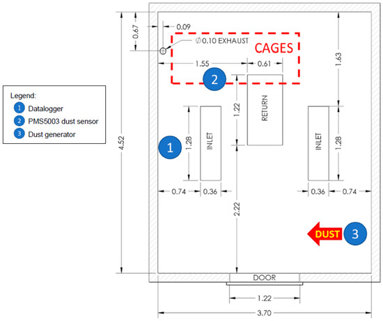 Plan view of controlled environment TEST chamber (all dimensions shown in meters). Location 1 = datalogger (0.3 m above floor), 2 = PMS5003 dust sensor (2 m above floor, on top of cages), 3 = dust generator (1 m above floor). Exhaust, inlet, and return openings were in the ceiling.