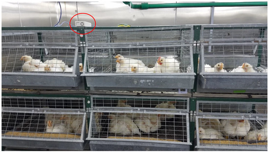 PMS5003 dust sensor enclosure (circled in red) placed on top of laying hen cages.