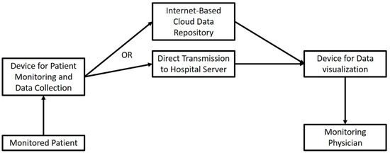 In order to complete our appraisal of the IoT concept in surgical specialties, we would be remiss if we did not include the potential uses outside the operating room (Supplemental Table S3). Medical telemonitoring usually consists of a specialized “smart” device that captures target parameters and transmits them through a wireless Internet connection, either directly to the referring physician, or to a centralized repository from which they can be accessed (Figure 3). The role of the Internet here is more straightforward: instead of being the network substrate that interconnects a variety of operating stations, data repositories and data processing modalities, here, it is used as a unidirectional “data highway” that runs towards the physician. In contrast to previous advances, telemonitoring has been widely implemented in some healthcare systems.