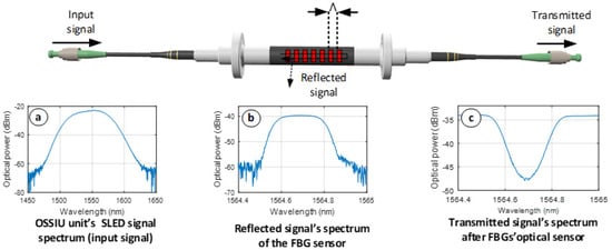 The optical spectrum of the input signal is visible in Figure 1a. The optical signal is transmitted through the optical fiber as shown in the middle-upper part of Figure 1, where the FBGs sensors are inscribed. The reflected optical signal of the FBG sensor at the reference wavelength can be seen in Figure 1b. This reflected optical spectrum of the strain sensor is processed and observed in our mobile OSSIU unit. Figure 1c, on the other hand, shows the transmitted optical signal after passing the FBG strain optical sensor.