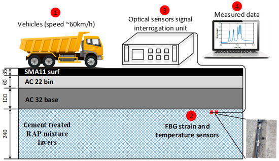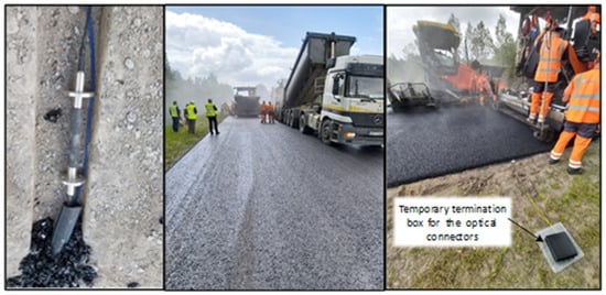As can be observed in Figure 2, the FBG strain and temperature sensors are embedded in the upper part of the 240-mm-thick cement-treated RAP mixture layer, specifically, 25 mm deep inside the cement-treated RAP mixture layer, that is, under 35-mm-thick SMA11 (stone mastic asphalt), 60-mm-thick AC22 and 100-mm-thick AC32 (asphalt concrete) layers and monitored remotely with OSSIU. It detects all the induced strain (and thus reflected wavelength/frequency shifts of the FBG optical sensor) by the vehicles passing the upper layer of the road. Unlike our previous research [14], where FBG optical sensors were embedded within the temporary road—between 30-mm-thick SMA11 and 60-mm-thick AC11 layers—in this research, we have chosen a different approach by studying the embedment of deeper FBG optical sensors in the cement-treated RAP mixture layer (~220 mm from the surface, see the left side of Figure 3) and strain measurement detection, and hence also test such technologies’ performance in permanent road infrastructure. In this research, new types of optical sensors are also chosen, providing a more reliable embedment realization in road infrastructure.
