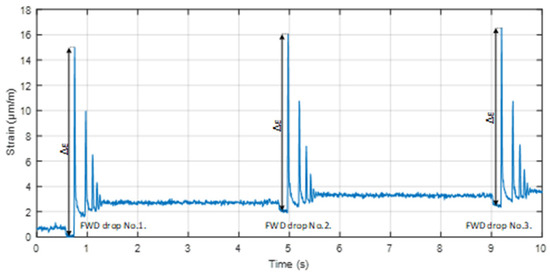 Afterward, 15 separate FWD load drops (with 50 kN load each) are made on the top of the location where the FBG optical strain sensor is implemented. Based on the measured data, the distribution of received strain values made by FWD drops (see Figure 7) is analyzed. This is performed to be certain that the installment process ensures precise strain detection (and that of its values) under continuous load conditions during the time. As it also does on the road infrastructure, when real-time transport traffic passes the road pavement, leaving multiple strain-induced changes in a quick period.