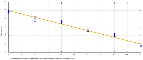 The numerical data gathered and shown in Table 3 are also visually depicted in Figure 8. Here, a correlation between the received strain values (measured with the FBG optical strain sensor) and FWD’s load plate centrum distance position (according to the FBG optical sensors’ embedment position) is observed. In the graph, blue dots with lines represent the average strain values and the measurement variation range.
