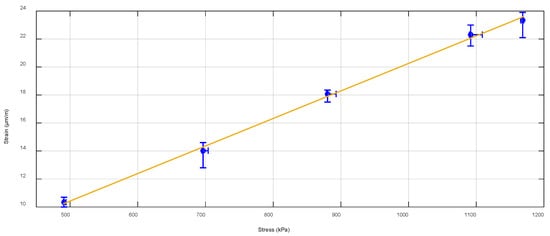 Further into our research, to evaluate the precision of our previously mentioned real-time transport traffic strain measurement experiments (discussed in more detail in Section 5), further repeated tests are made (approximately half a year later from the time of the first experiments) by using the same FWD device. The temperature of the road’s cement-treated RAP mixture layer in these experiments is measured by our embedded FBG temperature’s optical sensor and is in the range of 24.8–25.1 °C. The effect of the temperature on the received strain amount is explained in more detail in Section 4.3. Here, we position the dropping plate of the FWD device right on the embedment position of the FBG strain optical sensor. Then, by changing the FWD’s applied stress values (from 470 kPa to 1170 kPa, with a step of ~200 kPa between the minimal and maximal values), we measure and record the received strain (μm/m) values. For each level of applied stress, 10 drops (5 times in a row, in 2 series) are made. In Figure 9, the received strain (μm/m) values at FWD’s generated stress levels (kPa) are shown, as the blue dots with lines represent the average strain and stress values, as well as the strain and stress measurement variation range.