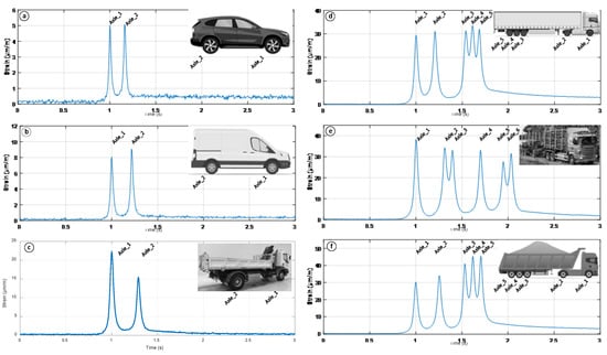 As experiments with the FBG strain optical sensor and FWD device approved the stable and correct operation, the next research phase consists of real-time transport traffic strain monitoring experiments. The temperature within the cement-treated RAP mixture layer during experimental measurements varies within a range of 1–1.5 °C. We have measured and recorded traffic that was passing over the road’s (specific location mentioned in the Section 3 of this article) pavement above the FBG’s embedment position. Moving vehicles there consisted of 2-axle passenger cars and up-to-6-axle heavy trucks. As there are different types of transportation passing the road, to better comprehend the strain-induced changes and their amount, we categorize all of the transport into four classes by the most common transport types passing the specific road. Those classes are: 2-axle passenger cars (Figure 10a), 2-axle minibuses (Figure 10b), 2–3-axle trucks (Figure 10c) and 4–6-axle trucks (Figure 10d–f).