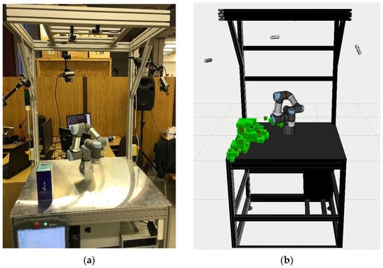 Demonstration image of the output from MoveIt! filtration: (a) real workspace; (b) simulation.