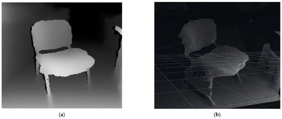 A fundamental aspect of 3D space representation is the form in which the environment is described. The most basic representation is the point cloud, which can be computed, for example, using stereo vision []. Based on the camera stream resolution, the number of points in space that correspond to each pixel in the depth image is obtained, see Figure 2.