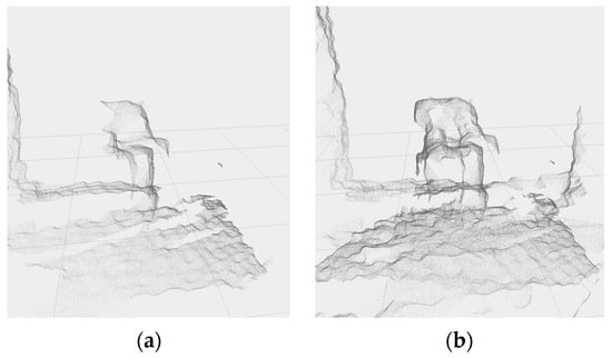 Merged point clouds (data from camera Intel Realsense D435i with 1280 × 720 resolution) in the workplace coordinate system: (a) data from camera D; (b) data from cameras A and D (cameras transformation was calibrated by []).