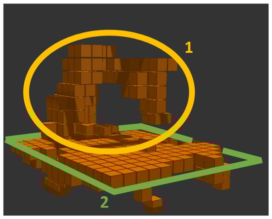 For such a situation, it is necessary to filter a static workplace and a moving robot within it. There are already functional tools for such an application, such as MoveIt! [], implemented in the ROS (Robotic Operating System)[] environment. MoveIt! allows connection of 3D cameras and the use of post-processing to filter the workplace data so that only obstacle information is retained, e.g., in the form of voxels [] as illustrated in Figure 1 by the green obstacle voxels.