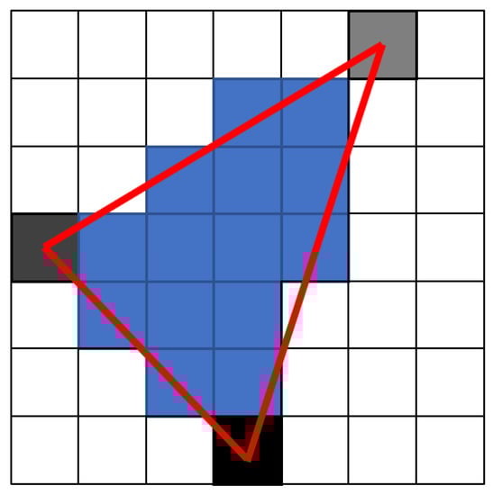At this point, there are already specific pixels of triangle vertices with expected depth. The depth represented by the greyscale of each vertex of the triangle is then interpolated for pixels inside the triangle (blue), see Figure 6.