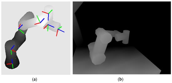Rendered UR3 robot: (a) with coordinate systems attached to individual links according to the Denavit–Hartenberg principle (the blue z-axes represent the axes of rotation); (b) reconstructed expected depth map of the workspace.