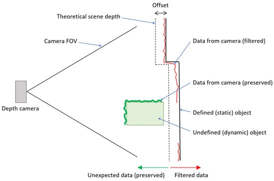 Once the actual scene has been completely reconstructed (Defined static/dynamic object), the real workspace scene obtained by the cameras can be compared with the calculated expected depth image. However, it is necessary to realize that the real camera captures with certain accuracy (data from the camera), and it is impossible to compare the real and expected depth exactly. Therefore, a sufficient offset needs to be added to cover the inaccuracy of the camera sensing, see Figure 8. This approach filters out all objects where the distance of expected depth (with offset) is less than the distance of the actual depth. The diagram shows the principle where the environment is defined (as a line Defined (static) object). The expected depth of the scene is identical to the real one but is offset to capture the basic inaccuracy of the camera (data from the camera(filtered)—red line). The un-defined (dynamic) object is before the expected depth (from the camera view), so this data is not filtered.