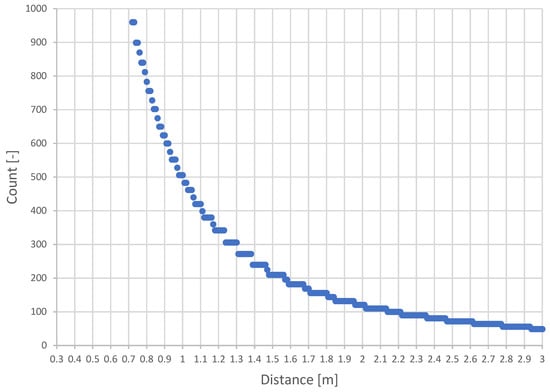 The maximum possible density of points representing a voxel is variable based on the distance from the camera. The relationship between voxel occupancy and distance for a 5 cm voxel and the resolution of the Intel RealSense D435i 640 × 480 [px] camera is shown in Figure 9. It depicts the count of points per voxel according to the minimum and maximum possible sensing distance of the camera.