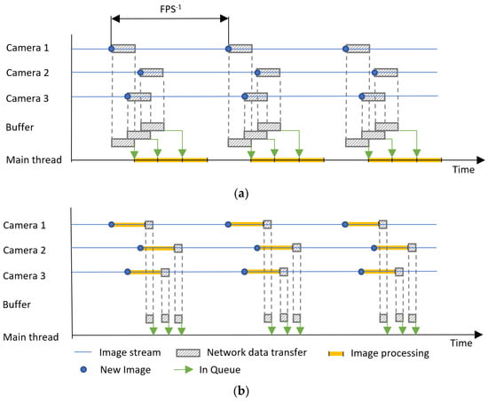 Figure 10 represents only symbolic block sizes and demonstrates the principle of a centralized and distributed system and the ratios do not correspond in any way to the real scenario. Figure 10 describes the case with three cameras at a general FPS (Frame Per Second).