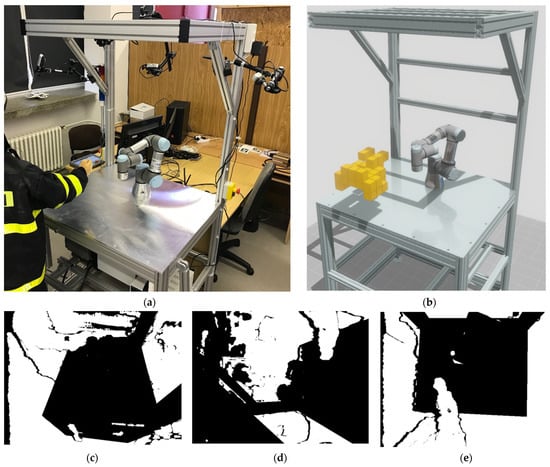 The result is a reconstructed robot model according to the actual joint rotations, see Figure 7a. In Figure 7b, the result of an expected depth image created from the CAD models of the workspace and the actual position of the UR3 robot is shown.