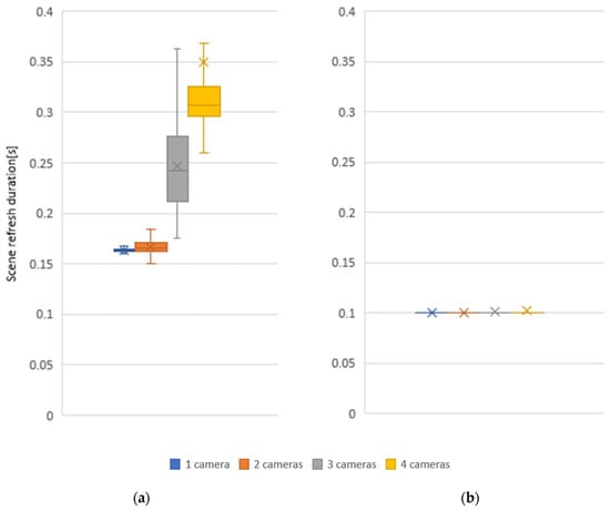 Effect of the number of cameras on the scene refresh duration for 1280 × 720 camera resolution and voxel size 20 mm: (a) centralized; (b) distributed.