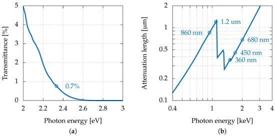 (a) Transmittance of 500 nm of GaAs versus photon energy from 2 to 3 eV obtained with IMD software [42]. (b) Attenuation length in GaAs versus X-ray energy from 400 eV to 4 keV [43]. The marked points indicate the energies at which the measurements were performed.