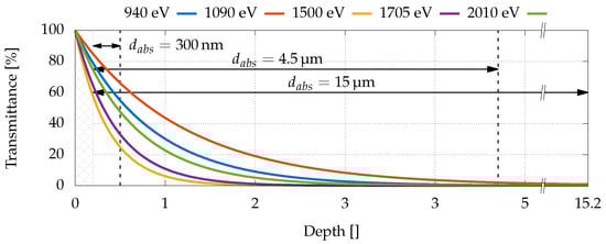 To overcome these limitations, quantitative measurements were carried out with a low-energy synchrotron radiation beamline at Elettra Sincrotrone Trieste. The beamline (TwinMic [44]) has a short undulator and focusing optics, generating a sub-micrometric monochromatic pencil beam in the energy range between 400 and 2200 eV, a range in which the GaAs attenuation length varies significantly (see Figure 2b). The beamline is equipped with scanning stages and eight spectroscopic Silicon drift detectors, which allow performing two-dimensional mesh scans with sub-micrometric pitches while acquiring the X-ray fluorescence spectra of the sample when the monochromatised X-ray beam is impinging perpendicularly. In this way, it is possible to carry out APD surface chemical analyses while simultaneously acquiring maps of the photogenerated current. Typical step sizes for the experiment discussed here were 10 m × 10 m, while the beam size was set to 2 m, providing a flux of 2 × 10 photons/s. The incident photon flux was monitored with an AXUV 100 PIN diode, which was previously calibrated by the Physikalisch-Technische Bundesanstalt (Berlin, Germany). For the considered photon energy range, the spectral responsivity was 0.2705 ± 4 × 10 A/W. For the study at hand, five distinct photon energies were chosen (940, 1090, 1500, 1705, and 2010 eV) in order to change the distribution of the e-h generation, which depended on the associated attenuation lengths (respectively, 860 nm, 1.2 m, 360 nm, 450 nm, and 680 nm, as shown in Figure 2b). As expected, the depth-dependent transmission in Figure 3 shows that a higher percentage of photons were absorbed deeper inside the absorption region as the attenuation length increased. Therefore, if defects in the absorption region were responsible for a reduction of the collection efficiency, the latter would also change with the attenuation length.