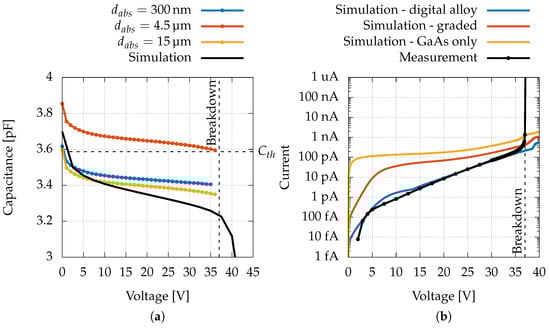 Figure 4b shows that the simulated dark current of the device modelled with the digital alloy (blue curve) presents an overshoot with respect to the measurement for voltages below 15 V. This strange behaviour, never seen in the experimental devices, could be attributed to a wrong response of the SRH model when coupled with the heterointerfaces of the digital-alloy structure. In particular, this layer is very thin; effects related to tunnelling, not included in the model, may be present. For example, it was observed that when replacing the digital alloy with a graded transition (where the molar fraction of the Al was linearly increased up to 0.45), the hump disappeared, but the current also changed by orders of magnitude. On the other hand, if only GaAs was considered, the current increased and the current step caused by the punch-through became wider. Clearly, the presence of many thin layers with different compositions pushes the drift-diffusion model with local SRH to its limit. Obtaining a better modelling description of the dark current is however beyond the aim of the current paper.