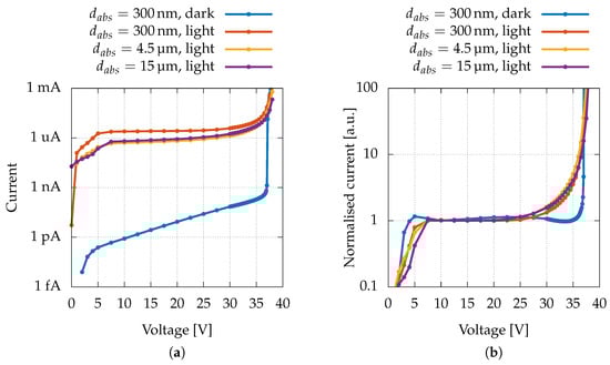 In Figure 5b, we report a comparison between “normalised” dark and photoinduced currents, in order to highlight the fact that the multiplication starting at 25 V does not involve the dark current. As will be discussed in Section 3.2, normalisation should be understood as the division of the measured currents by the exponential function obtained by interpolating the data in the range 7.5–22.5 V.