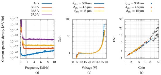 As explained before, the ENF determination requires the precise measurement of the APD power spectral density (Equation (5)). The front-end input-referred noise floor is shown in Figure 6a (blue trace), which has a minimum value of 3 × 10 A/Hz at 1 MHz and which is almost entirely caused by thermal noise of the feedback resistor ( = 2.9 × 10 A/Hz) at room temperature. For higher frequencies, the noise floor increases owing to the input-referred voltage noise of the operational amplifier ( = 4.3 nV/ [46]), which, above the cut-off frequency MHz, is amplified by a factor . The total input capacitance (device and wires) is approximately 25 pF; therefore, the resulting maximum noise floor (expressed as the power spectral density of the current) is approximately × 10 A/Hz.