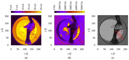 The top of the mesa is visible in the photocurrent map, where low photocurrents are indicated with dark violet shades and high intensities with light yellow shades, respectively, whereas the central area is obscured by the Al bond wire, which provides the electrical connection of the window electrode to the preamplifiers. The wire is also clearly visible in the simultaneously-acquired X-ray fluorescence map, which displays on a pixel basis the number of measured As L fluorescence photons with an energy of 1282 eV (Figure 7b).