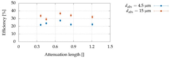 In Figure 8, we report the change in efficiency as the attenuation length increased. It can be observed that there is no clear dependence on the attenuation length as no evident trend can be observed for both sensors. The modest variations between one energy and another are most likely due to systematic errors. In fact, at each change of energy, it was necessary to reposition the sample; for this reason, each measurement was probably performed on a different position of the device, yielding the observed differences in efficiencies.