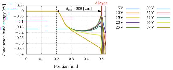 Finally, as we have seen, the measurements made with the laser as well as with the synchrotron light, showed the presence of a photogenerated current at voltages lower than the punch-through voltage; that is, in a condition in which APDs do not commonly show sensitivity to light. This behaviour is a consequence of the deposition of a thin sub-monolayer of C atoms ( p-doping), and it can be understood by using the same Sentaurus TCAD simulations that reproduce capacitance versus inverse bias: the variations of the potential barrier at the layer as the reverse bias increases are displayed in Figure 9. It emerges that, for heavily doped and very thin layers (in principle, almost less than a monolayer), the voltage barrier preventing diffusion of electrons from the absorption layer into the multiplication region is very low, and it decreases slowly when the bias is increased. This allows to obtain relatively high photogenerated currents even below the punch-through voltage [35]. In these simulations, the disappearance of the potential barrier and the onset of the punch-through take place at about the same voltages at which the start of breakdown is experimentally observed.