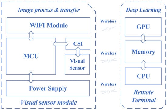 The wireless visual sensor system consisted of a visual sensing module and a remote terminal. The visual sensor module, as shown in Figure 2 and Figure 3, included a visual sensor (DCX-OV2640-V2, ALIENTEK, Guangzhou, China) and a microcontroller unit (ESP32-S, ANXINKE, Shenzhen, China) with an integrated Wi-Fi module. The image resolution of the visual sensor was 1024 × 768. The remote console consisted of a CPU (Intel Xeon Gold 6240 2.6 GHz), GPU (NVIDIA Tesla V100 32 GB),and internal memory.