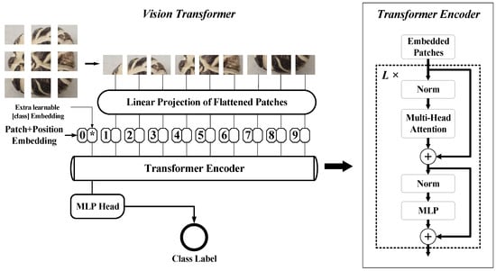 ViT is an image-classification model based on a pure transformer structure that, along with its variants, is gradually being applied in various fields. The core process of ViT includes creating patches, patch embedding, positional encoding, transformer encoding, and multilayer perceptron (MLP) classification [], as shown in Figure 6.