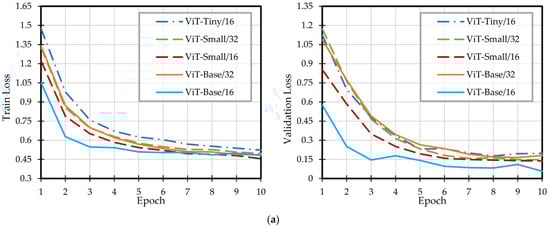 The commonly used ViT models are of 5 different sizes, classified by the number of embedding dimensions and the number of parameters. The processing speed and accuracy will differ due to different sizes, so that they can be applied to different problems. Generally, there are five different sizes of models available, which are Tiny, Small, Base, Large, and Huge. Their parameter quantities are 6M, 22M, 86M, 307M, and 632M, respectively. In addition, models of the same size also vary by the size of patches into which an input image is divided; , , , and are the typical sizes of patches. This article used the model size and patch size to describe a specific ViT model. For example, ViT-Base/16 is a ViT model with a size of Base and a patch size of . Only Tiny-, Small-, and Base-sized models were used in the experiments, as the computational cost of larger models would become unbearable.