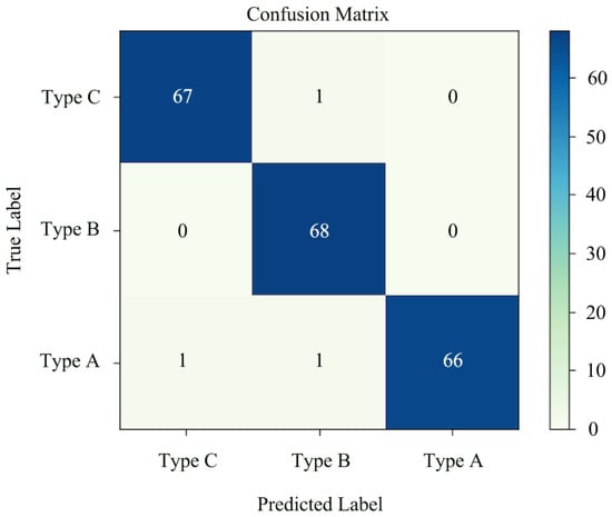 As shown in Figure 8 and Table 2, the overall accuracy rate of the shiitake mushroom sorting was 98.53%. The resulting model did not mistakenly include other species in Type A. At the same time, all the given Type B samples were successfully detected correctly. The F1-scores of the three types were similarly high, which indicated that the model had a better judgment ability for each type.