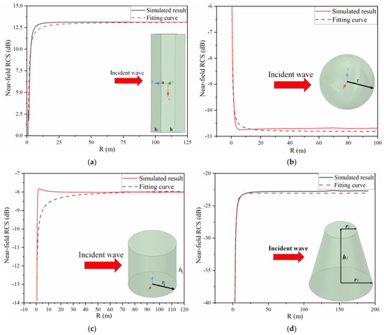 Numerical simulated results and fitting curves of the near-field radar cross section for different targets. (a) Plate; (b) sphere; (c) cylinder; (d) conical frustum.