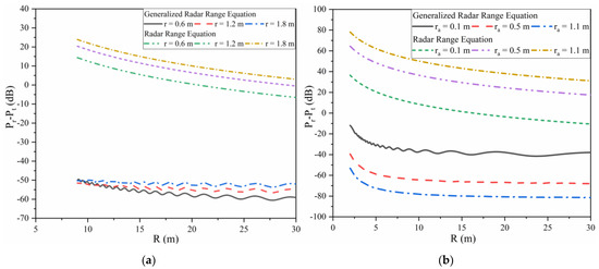 In this experiment, the size of the plate is ; for monostatic THz radar systems, the wavelength is 1 mm and the radius of two identical aperture antennas is 0.1 m. As shown in Figure 4a, the value of the purposed radar equation is smaller than that of Equation (1) and augments in the near field with the increase in R. When the range R approaches infinity, these two curves tend to be coincident. The value of in the far-field zone calculated by Equation (13) is a variable only proportional to , which has the same form as Equation (1).