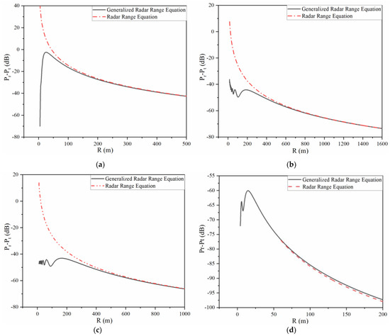 The generalized radar range equation is the widespread use of the near-field gain expression. Substituting the gain and the RCS of the radar range equation with the above near-field gain and near-field RCS, it can be derived. The calculation result in the near field is below 0 dB and smaller than that calculated by Equation (1). Moreover, the generalized radar range equation can be simplified into Equation (1) in the far field.