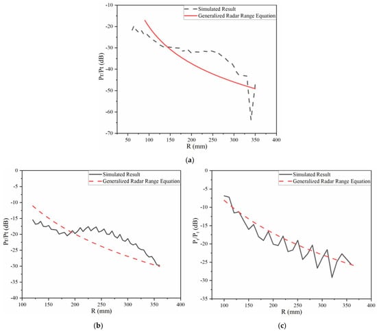Figure 6a shows the results of when the target is a metal sphere in this model. It can be observed that the tendency of through the full-wave simulation analysis and generalized radar range equation hold the same form. The maximum error between the simulated analysis and calculation result is less than 4 dB, which indicates the accuracy of the purposed Equation (13). The error between different results is firstly due to the unknown aperture field distribution. In addition, the transmitting and receiving antenna cannot be placed in the same position because of the restriction of this model. Thus, the scattered electric field of the target and the incident electric field from the transmitting antenna cannot remain in the same direction and ensures that the incident wave is vertical incidence. The value of the scattered electric field appears to be deviation.