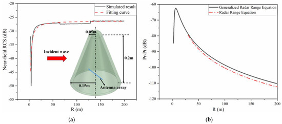 The unity of the proposed generalized radar range equation is demonstrated through the fitness with the radar range equation in the far field, assuming the maximum value of the RCS for normal incidence can be obtained in (1) [25]. Figure 4 shows the relationship between the and range R in the whole range; the results of are obtained by Equation (1) and generalized radar range Equation (13), respectively.