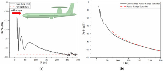 Figure 8a shows the whole region RCS results of the early warning aircraft. The value of far-field RCS is −19.51 dB through numerical simulation and the near-field RCS approaches it in the far field. Figure 8b displays the results computed by the generalized radar range equation in the whole range and (1) in the far field. It can be found that fluctuation of the curve occurs in the Fresnel zone and the overall trend gradually drops down and fits the dotted line. The discrepancy between these two lines in the far-field region is about 0.1 dB.