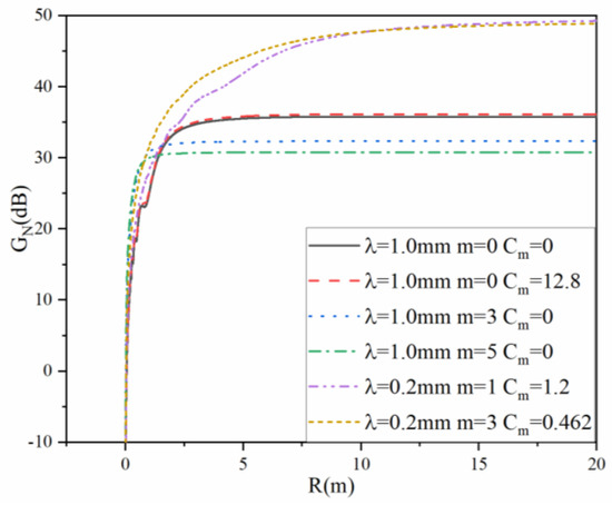 In this model, the wavelength is 0.1 mm and the aperture radius is 0.1 m. The radius of this target is 0.05 and its height is 0.1 m. It can be discovered from Figure 4c that the curve of Equation (13) fluctuates with the value of lower than 0 dB in the near field. Such fluctuation in both (b) and (c) reveals that many elements affect the value of . The solid line (Equation (11)) and the double-dotted line (Equation (1)) are falling in the far field and can gradually overlap.