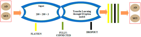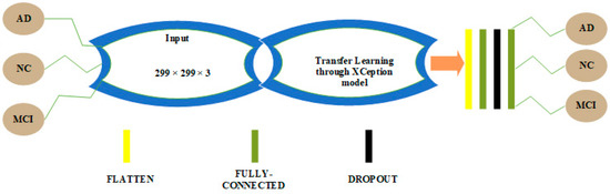 The 2D CNN architecture for binary classification between the AD and MCI classes is shown in Figure 4. We chose the Xception model as a transfer learning model once more. We eliminated the last layers of the Xception model and replaced them with a flatten layer, an FC layer of 256 neurons, a dropout layer with probability 50%, and a second FC layer with a single neuron driven by the sigmoid function.