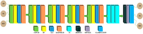 The CNN architecture in 3D domain for multiclass classification is shown in Figure 3. An input of 79 × 95 × 69 is utilized in this architecture, which is initialized with a zero center normalization technique that divides each dimension (channel) by its standard deviation and subtracts the mean from each of these dimensions. After then, a block is repeated five times in a row. This block contains a convolutional feature extraction layer with a kernel size of 3 and 6 feature maps with a weight and bias L2 factor of 0.00005, which is used to push the weights closer to the origin. The main purpose of this convolutional layer is to extract features. Following the convolutional layer, a batch normalization (BN) layer is added to act as a regularizer and speed up the computations, followed by an exponential linear unit (ELU) activation layer with its hyperparameter α set to 1 and a maxpooling layer with filter and stride size 2 × 2 × 2, to reduce the spatial feature maps dimension and reduce the number of computations required by the network. Finally, there are three dense layers, a dropout probability of 0.1 layer, a softmax nonlinear layer, and a classification layer. To tackle the multiclass classification issue, the first fully connected (FC) layer has 100 neurons, the second has 50 neurons, and the third has three neurons. The weight and bias L2 factors of these FC layers are 0.00005.