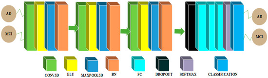 Figure 9 depicts the CNN architecture in 3D for this task. There is an input layer in this design that accepts a volume of dimension 79 × 95 × 69 that has been initialized with the zero-center normalization process. Then, in a sequential method, a block is repeated 5 times. A feature extraction convolutional layer with kernel size 3 and 4 feature maps is included in this block. This layer is followed by a BN layer, a nonlinear layer with an ELU activation function with its hyperparameter α set to a value of 1, and a maxpooling dimensionality reduction layer with a filter and stride size of 2. Finally, there are three FC layers followed by a softmax activation function layer and a classification layer. There is a layer with a dropout probability of 10% immediately preceding the softmax layer. To solve the binary classification problem, the first FC layer has 100 neurons, the second has 10 neurons, and the third one has two neurons.