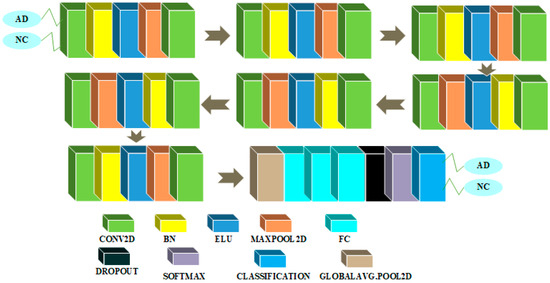 Figure 6 shows a 2D CNN architecture for 2-class classification between AD and NC classes. This architecture embeds the blurring before subsampling principle. The input layer in this design accepts size 79 × 95 and is initialized with the zero center normalization process. Then, a block is repeated three times in a row. The convolutional layer is trailed by a layer to implement the BN procedure, an ELU nonlinear activation layer with its hyperparameter α set to 1, a dimensionality reduction layer with maxpooling operator with filter size 2 and stride size 1 to reduce the spatial dimension of feature maps, and another convolutional feature extracting layer with kernel and stride size 2 and number of feature maps equaling 64 with a weight and bias L2 factor equal to 0.00005. Then, another block is repeated three times in a row. This block has a convolutional feature extraction layer with a kernel size of 3 and 96 feature maps with weight and bias L2 factors of 0.00005. The convolutional layer is followed by a BN layer, which is followed by a non-linear layer with an ELU activation function with its hyperparameter α set to a value of 1, which is followed by a maxpooling dimensionality reduction layer with a filter size of 2 and a stride size of 1, which is followed by another convolutional feature extracting layer with a kernel and stride size of 2 and 96 feature maps with a weight and bias L2 factor of 0.00005. Then, another block is repeated once in a row. This block has a convolutional feature extraction layer with a kernel size of 3 and 128 feature maps with weight and bias L2 factors of 0.00005. The convolutional layer is followed by a BN layer, which is followed by a non-linear layer with ELU activation function and its hyperparameter α set to 1, which is followed by a maxpooling dimensionality reduction layer with filter size 2 and stride size 1, which is followed by another convolutional feature extracting layer with kernel and stride size 2 and 128 feature maps with a weight and bias L2 factor of 0.00005. Finally, there is a global average pooling layer that averages out all features inside a feature map, followed by three dense layers, a layer with a dropout probability of 0.1, a layer with a softmax activation function, and a data classification layer. To solve the binary classification problem, the first FC layer has 300 neurons, the second has 100 neurons, and the third has 2 neurons.