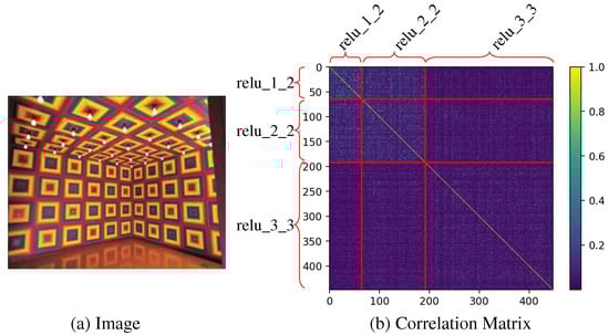 Correlation between channels (b) in the multi-scaled feature maps of an input image (a) extracted from the pre-trained VGG16 feature network []. The area corresponding to each scale of feature maps (relu_x_x) is divided by red lines. The diagonal rectangles of the correlation matrix (b) represent the intra-scale correlation between channels of the same scaled feature map (channels of relu_x_x), and the other rectangles represent the inter-scale correlation between the channels of two different scaled feature maps (channels of relu_x_x and relu_y_y).