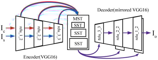 To exclude any influence of network structure on image style transfer, we commonly used VGG16 feature network [] as an encoder network and constructed a decoder network with the mirrored architecture of the encoder. Note that the number of convolution filter channels of the skip-connected layers in the decoder network was doubled. We used the feature maps of {relu_1_2, relu_2_2, relu_3_3, relu_4_3} to compute the style loss and used the feature map of {relu_3_3} to compute the content loss.