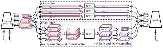 The transformed feature maps (Equation (2), intra-scale) or (Equation (4), inter-scale) are inserted into the corresponding decoder layers through skip-connections to generate an output stylized image. The details of this process are described in Section 3.2.